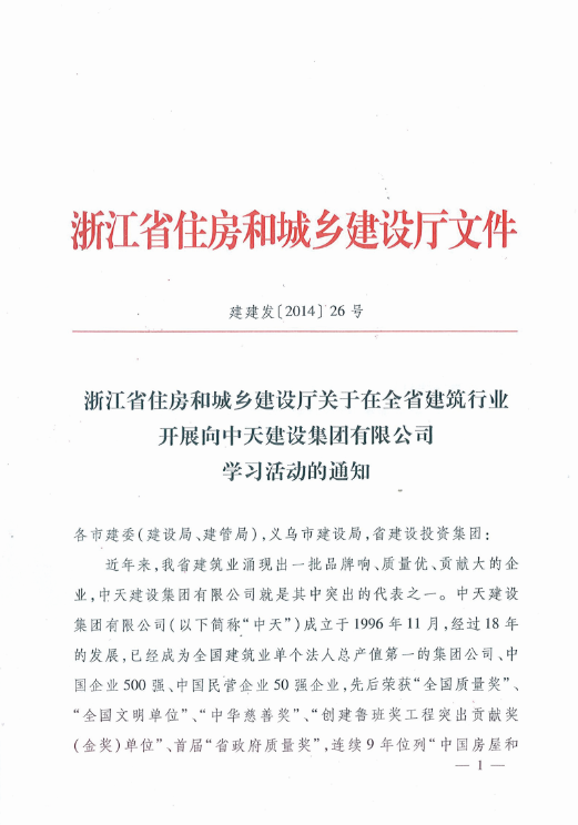 《浙江省住房和城乡建设厅关于在全省建筑行业开展向尊凯实业建设集团有限公司学习活动的通知》